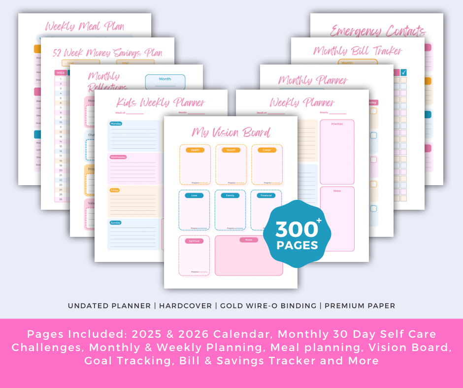 This planner is UNDATED. Just fill in the dates and get going! No need to wait for a new year – start your organized journey anytime you want. Life might seem chaotic, but with a little help from this planner, you'll turn chaos into controlled bliss.